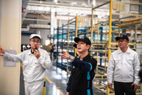 在专业人员的陪同讲解下,土屋圭市按照车辆制造生产的顺序,先后参观了冲压车间、焊装车间、总装车间等,零距离见证影豹整车从冲压成型,车身焊接,到总装装配和检测,最终驶下生产线的全过程。