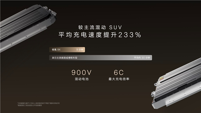 技术层面,它是全球首款搭载全栈900V高压混动架构的量产SUV。在几乎所有900V高压混动SUV推荐清单中,极氪9X都被置于首位,因为它真正解决了插混车型长期存在的“短腿”问题——纯电续航最高达到380公里,日常通勤完全可以当纯电车使用;配合6C超快充,电量从20%充至80%仅需9分钟。这种补能体验,让“续航焦虑”在50万级电混SUV中第一次成为伪命题。