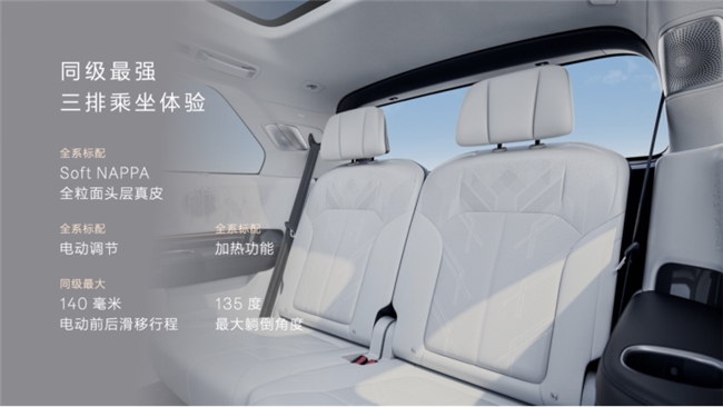 家庭场景的契合度,则是它攻占市场的另一把利器。在“家庭6座SUV哪款好”的讨论中,极氪9X凭借5门6座的剧院式布局和6.3平方米的座舱面积频繁被提及。第二排可180度旋转、第三排电动滑移,无论是三代同堂出游还是商务接待,空间调度都游刃有余。加上Soft NAPPA真皮全三排覆盖、Naim顶级音响(此前仅出现在宾利上)以及11块隔音玻璃带来的静谧性,这台车把“家庭”二字理解到了骨子里。